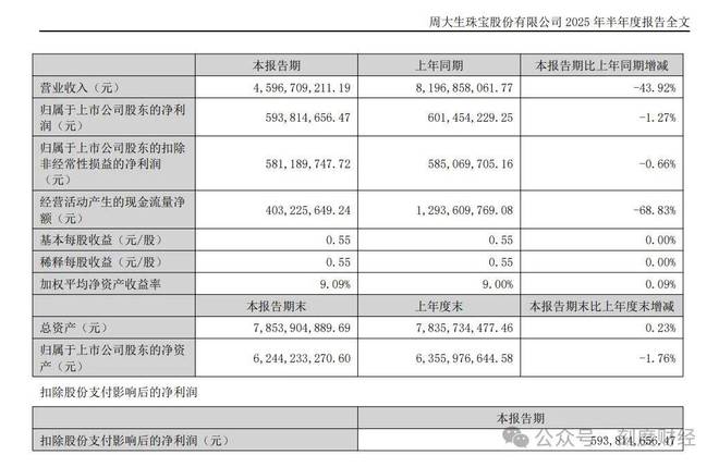 8月27日,周大生(002867)公布2025年半年报,公司营业收入为46.0亿元,同比下降43.9%;归母净利润为5.94亿元,同比下降1.3%;扣非归母净利润为5.81亿元,同比下降0.7%;经营现金流净额为4.03亿元,同比下降68.8%;EPS(全面摊薄)为0.5471元。