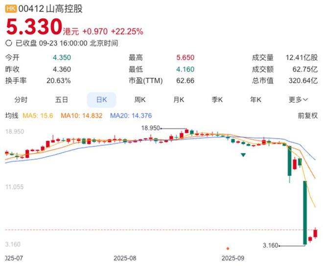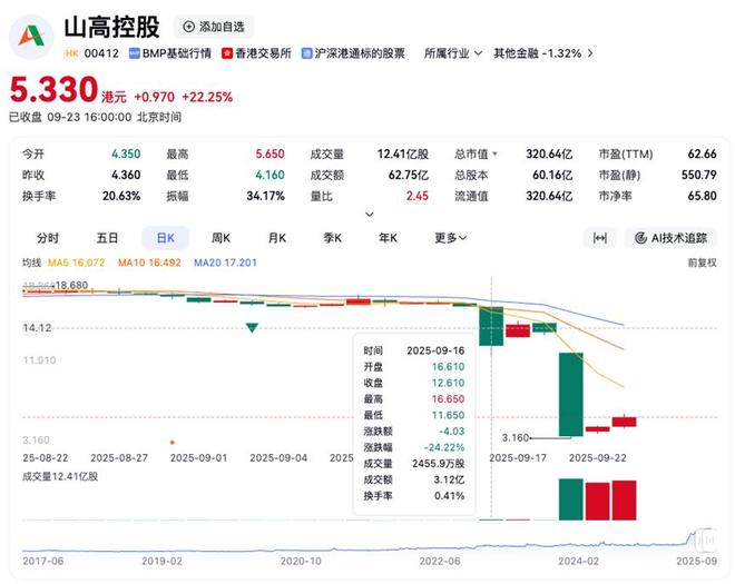 值得注意的是,香港证监会的提示并非空穴来风。9月16日,在基本面没有出现明显利空的背景下,山高控股股价突然下跌24.22%,报收12.61港元/股。