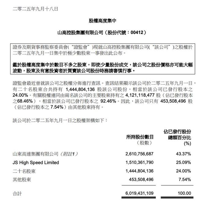 2025年9月18日,香港证监会发布公告称,截至9月1日,山高控股股权高度集中于少数股东,持股占比高达92.46%,仅7.54%股份由"散户"持有。香港证监会提醒投资者,因股权高度集中,即使少量股份成交,该公司的股价依然可能大幅波动,请投资者审慎行事。