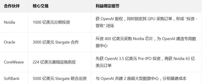 OpenAI 的交易网络早已超越简单的商业合作,形成了一张利益深度捆绑的生态网。从芯片巨头到云计算服务商,每个参与者都既是供血者也是受益者,构成了独特的 "风险共同体"。