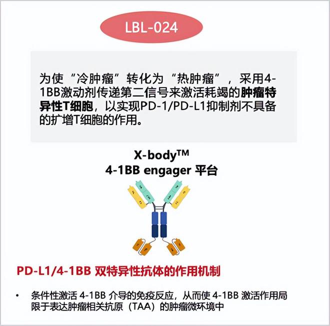 LBL-024诞生于维立志博自主研发并具有知识产权的X-body®平台,需要重点提及的是,这是一种同时靶向PD-L1与4-1BB的双特异性抗体,研发初衷是为了解决PD-1/PD-L1抗体无法解决的核心痛点。