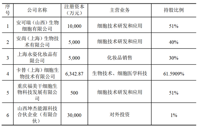 金坤杰拥有安可瑞(山西)生物细胞有限公司、卡替(上海)细胞生物技术有限公司等多家细胞技术、生物技术乃至化妆品公司的股权。