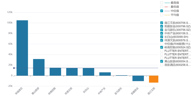 从同业比较看,Wind数据显示,酒店、餐饮与休闲类内地股票共11支,抛去锦江、首旅两家酒店集团,其余9支以2024年报显示营收、净利润看,曲江文旅2024年12.3亿元的营业收入处于行业中位值。但从2024年归母净利润的角度看,曲江文旅全年亏损1.31亿元,在9家上市公司中亏损最多。