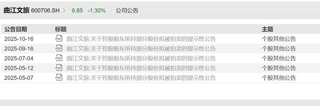 10月17日讯(记者 孙煜)10月15日,曲江文旅发布公告,控股股东西安曲江旅游投资(集团)有限公司所持1035.8215万股拟被拍卖,占公司总股本的4.06%,目前该部分股份处于冻结状态。