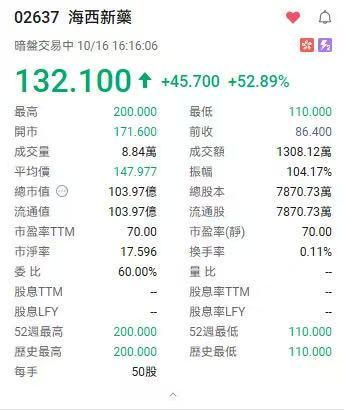 红星资本局查阅多家券商平台发现,10月16日,海西新药暗盘交易火热,富途证券暗盘一度上涨近53%,报132.10港元/股,不计手续费每手(50股)可赚2285港元;老虎证券暗盘收涨25.12%,报108.10港元/股。