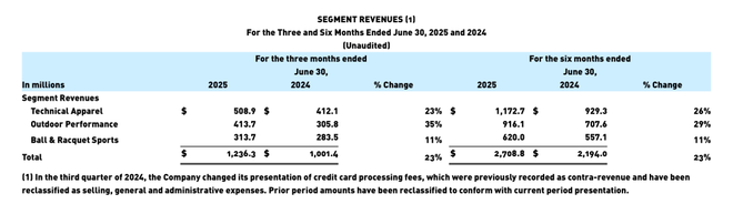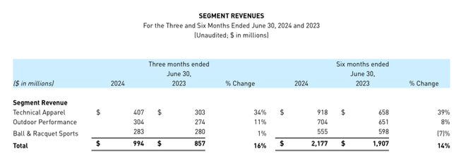 二季度,包含始祖鸟和壁克峰在内的亚玛芬技术服装部门(Technical Apparel)收入增长23%至5.09亿美元;包括萨洛蒙、阿托米克在内的户外运动部门(Outdoor Performance)收入增长35%至4.14亿美元;包括Wilson、ATEC在内的球类与球拍运动部门(Ball&Racquet Sports)收入增长11%至3.14亿美元。