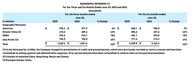 分地区看,二季度,大中华区超越北美,领跑亚玛芬各大市场,实现收入4.10亿美元,增速排在第二,达到42%,仅次于亚太市场的45%。