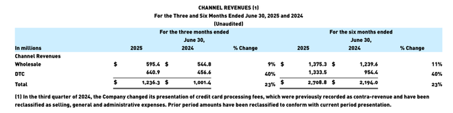 二季度,亚玛芬DTC渠道收入达到6.41亿美元,同比增长40%,在总收入中的占比为51.84%;批发渠道收入为5.95亿美元,同比增长9%,占比为48.16%。