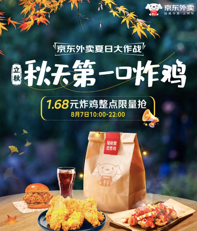 美团和淘宝闪购在"秋天的第一杯奶茶"上力度不小,京东虽然没在这个环节上加码,但也推出了1.68元开抢的"秋天的第一口炸鸡",错位营销避开风头正盛的美团与淘宝闪购。